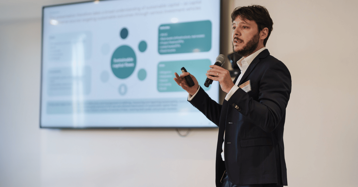 Later in the day, Alessandro Casoli, Global Head of Advisory and Director UK at Holtara (Apex Group), delivered an insightful presentation on the flow of capital in sustainable finance. Drawing on global data, he examined trends in regional investment, the growth of sustainable debt and the shift towards performance-based models.