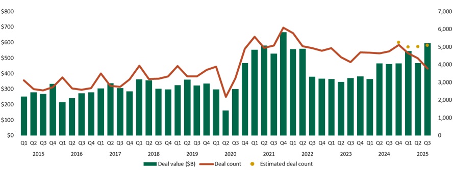 • Deal value: Jumped from $466.3B in Q2 to $595.3B in Q3 (+27.6%), an increase over the comparative period of 32%.